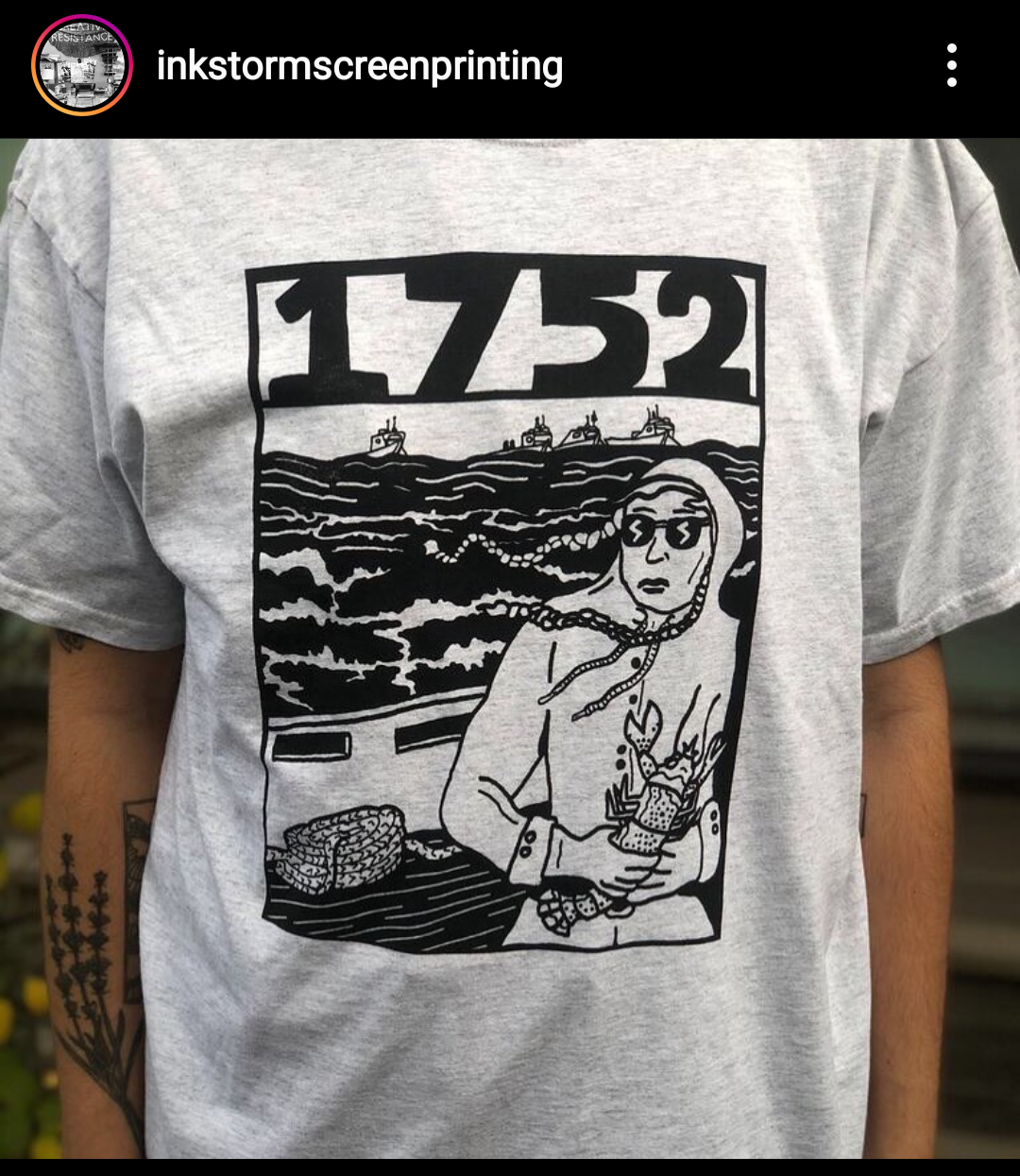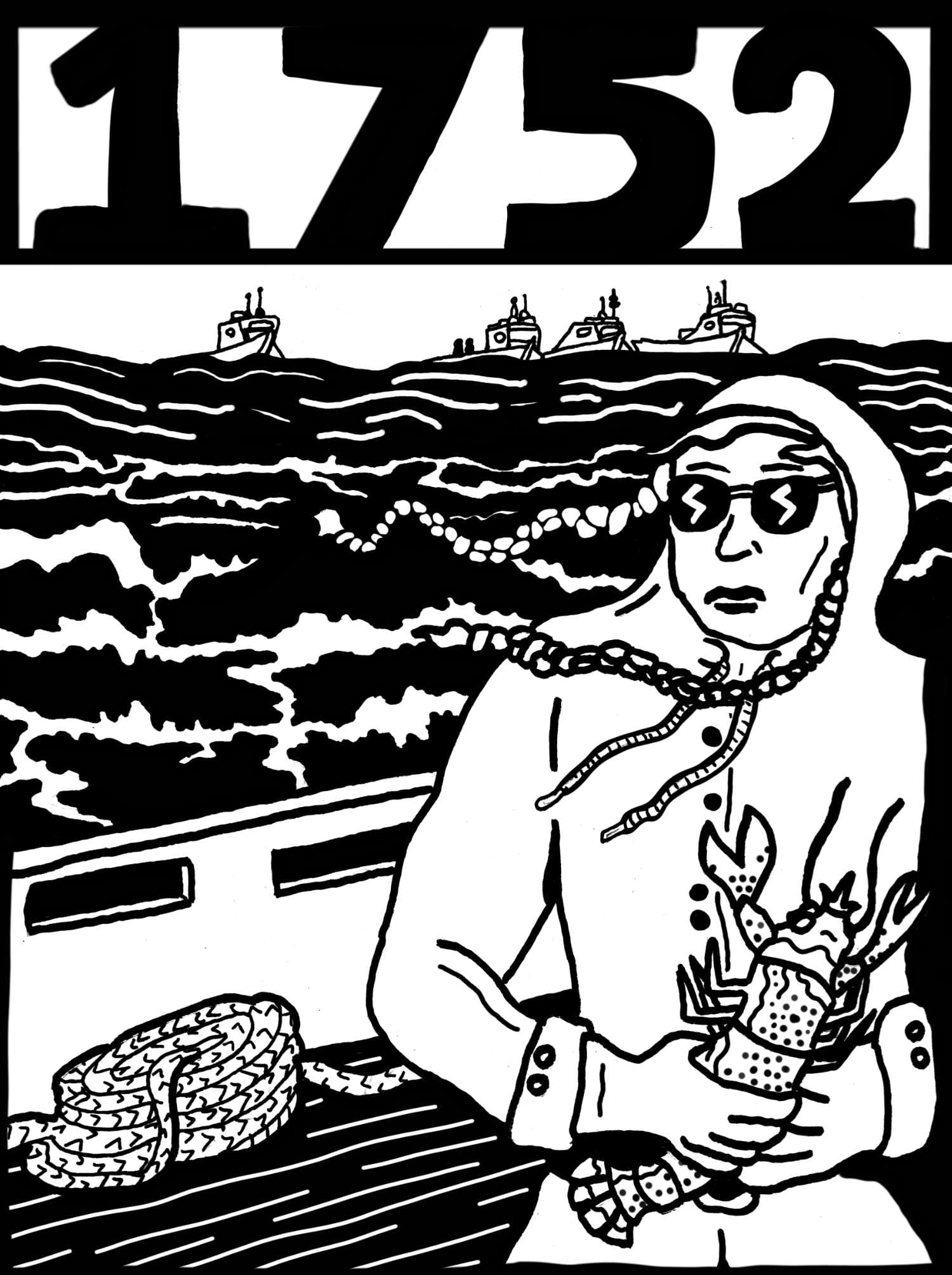 Black and white treatment for the 1752 print, a screenprinted t-shirt fundraiser for Mi'kmaw fisheries rights-holders in conjunction with Inkstorm screenprinting collective.